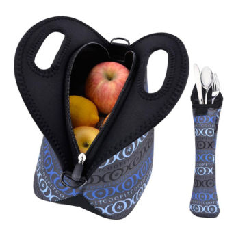 Durable and waterproof neoprene lunch bag keeps your food’s temperature locked inside with easy-slide smooth zipper closure, and keeps outside temperatures from degrading your edibles before you eat them. Comes with a velcro tableware storage bag to pack your spoons & forks.