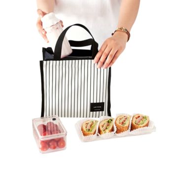 Beautiful Insulated lunch bag that is well suited for carrying food to work or to the office. Made of nylon, keeps the temperature of your dishes well. Available in black and striped designs.